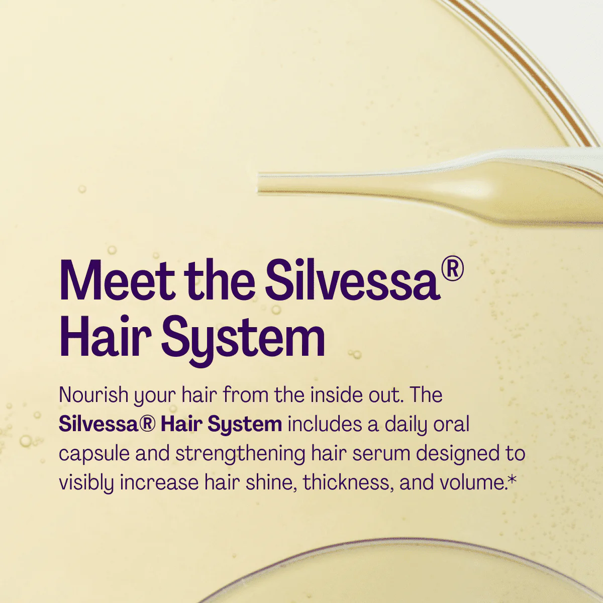 Nourish your hair from the inside out. The Silvessa® Hair System includes a daily oral capsule and strengthening hair serum designed to visibly increase hair shine, thickness, and volume.*